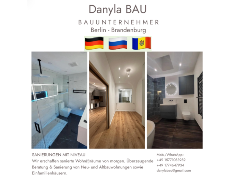 Max Maximus GmbH --> Работаем по Берлину и Бранденбург выезжаем на бесплатные замеры и консультируем по возникшим вопросам. Работаем давно, поэтому отработан определенный слаженный алгоритм, не нарушаем сроки и не выходим за смету. Договор приветствуется. Занимаемся строительством домов и ремонтами с нулевого цикла под ключ. Заливаем фундамент. Выполняем все виды кровельных и фасадных работ. Беремся за работу любого объема и сложности. Работаем, отталкиваясь от ваших предпочтений и бюджета. Всегда на связи! Тактичен , обязательный и ответствен. Обращайтесь, буду рад сотрудничеству. Gewerbe "Max Maximus" к вашим услугам! О нас: ✓ Опыт более 10 лет ✓ Качество, порядочность, пунктуальность ✓ Оплата нал и безнал ✓ Доставка материалов Услуги: - Капитальный, косметический, VIP ремонт офиса, квартиры, дома, помещения - Выравнивание стен цементно-песчаными,гипсовыми смесями - Грунтовка стен, потолков, откосов - Ремонт ванной комнаты - Малярные работы - Настил напольных покрытий - Укладка плитки на стены, пол - Электромонтажные работы - Сантехнические работы С уважением Макс