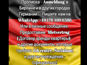 Прописка в Берлине и в других малых и болших городах Германии или в личные сообщения. Предоставим Anmeldung (Договор аренды квартиры) - и другие документы, которые требуют Job center , Sozialamt и другие учреждения - Официально! Термины в учреждениях Германии