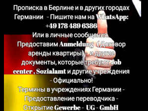 Пишите пожалуйста на Whatsapp. Термины в учреждения - Прописка Берлине, и в других городах Германии. Предоставим договор аренды - Mietvertrag, открытие GEWERBE, UG, GMBH, почтовый ящик, получение корреспонденции. Oткрытие GmbH, Прописка на следующий день. Помощь при смене земли. Прописка по всей Германии по доступным ценам! Можно без термина! Экспресс вариант в течение 12 часов! Регистрация по месту жительства Anmeldung - (прописка) по всей Германии от 1 до 12 месяцев, возможно с продлением. Почтовый ящик с вашей фамилией проверяется каждый день. Конфиденциальность гарантируeтся! Переадресация на любой вами указанный адрес! Вы хотите изменить налоговый класс, обращайтесь к нам. Вам необходимы другие документы? Мы их предоставим вам - ОФИЦИАЛЬНО!
